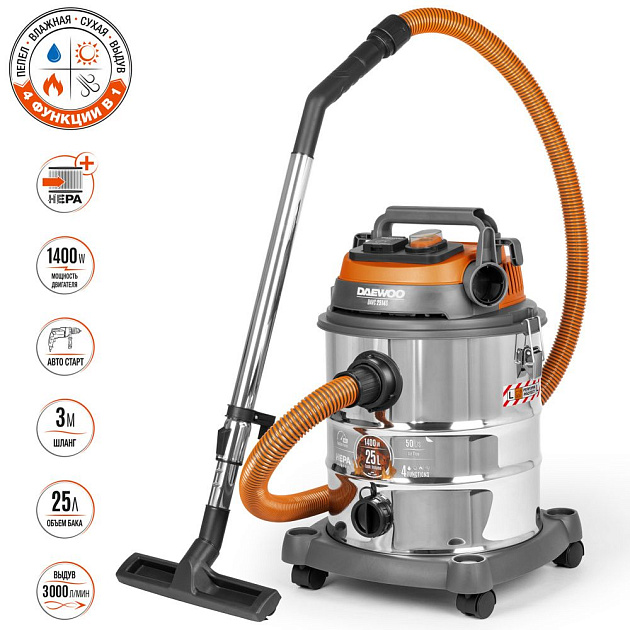 Достоинства: Очень мощный пылесос. В комплекте идет шланг и насадки для сбора золы
